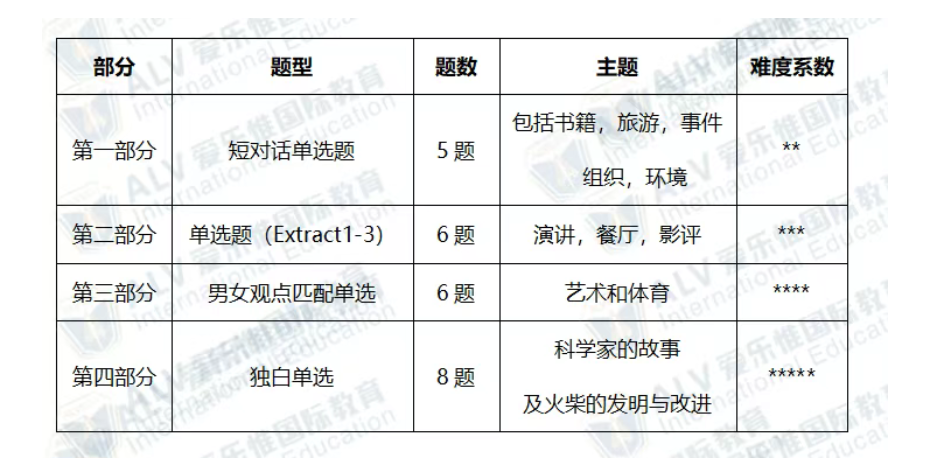 2025年3月第一场考试整体难度适中,题型和数量与2024年一致,第一和第二板块音频播放两遍,第三和第四板块只播放一遍音频并且乱序,整体难度逐步上升。