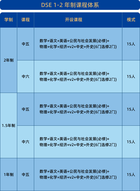 DSE 课程为中五、中六学生提供 1 至 2 年的灵活选择,包含必修科目如数学、语文、英语、公民与社会发展科,及物理、化学、经济等